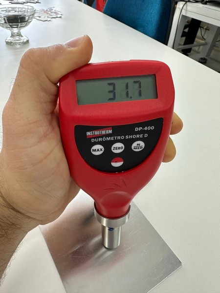 Durômetro Digital com escala D capaz de exibir valores de 0 à 100. O equipamento foi desenvolvido para determinar a dureza dos materiais.