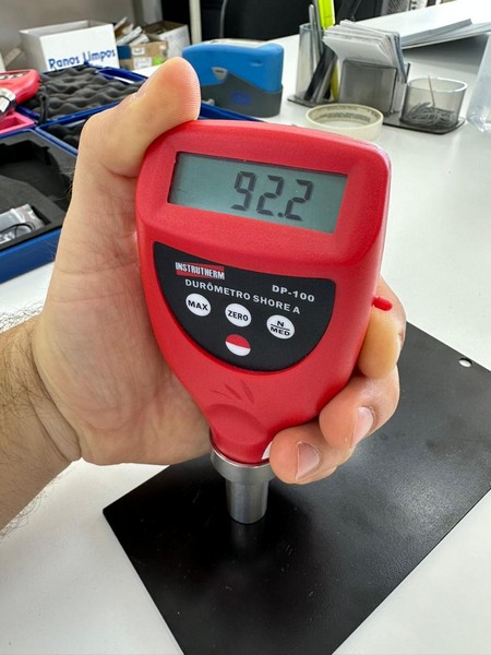 Durômetro Digital com escala D capaz de exibir valores de 0 à 100. O equipamento foi desenvolvido para determinar a dureza dos materiais.